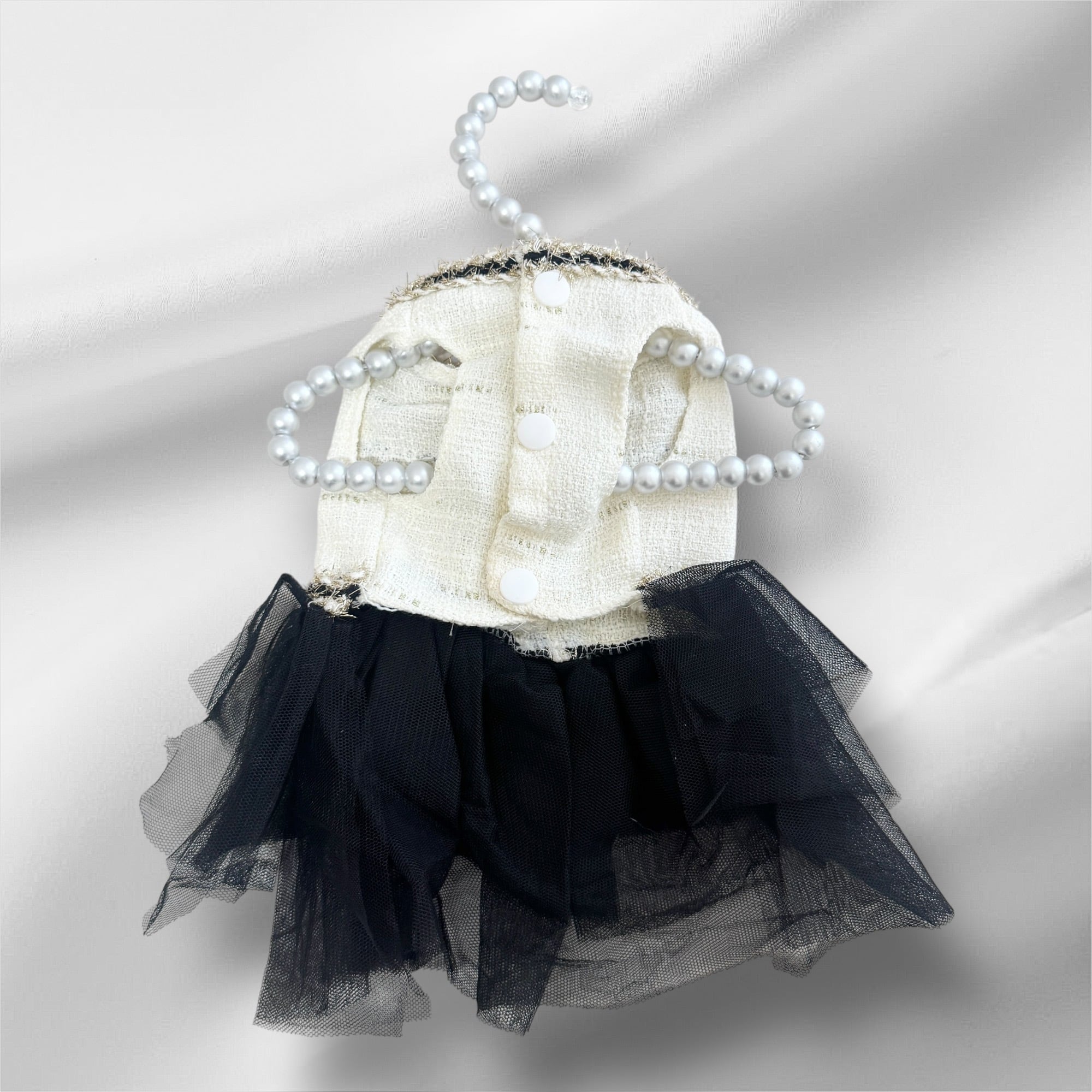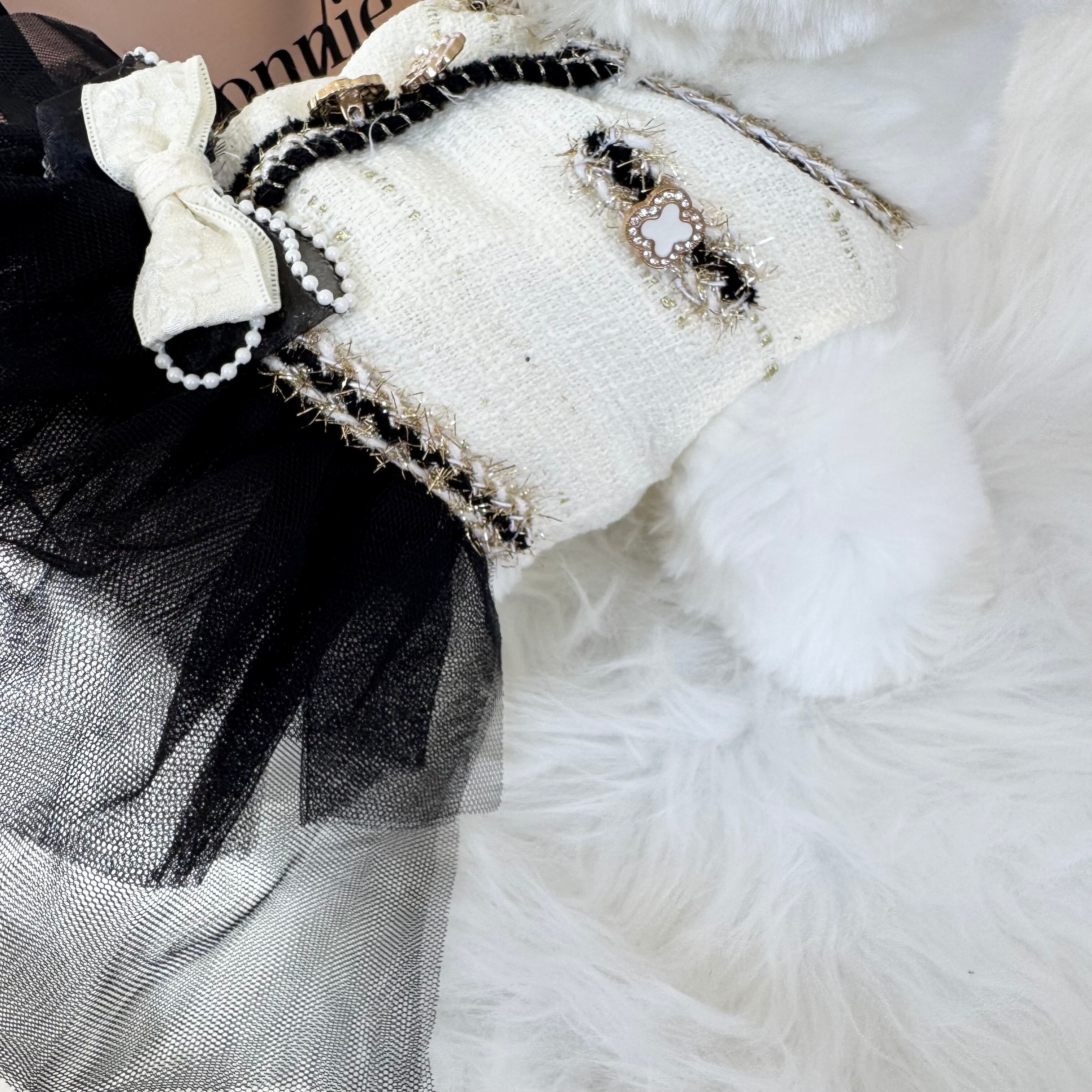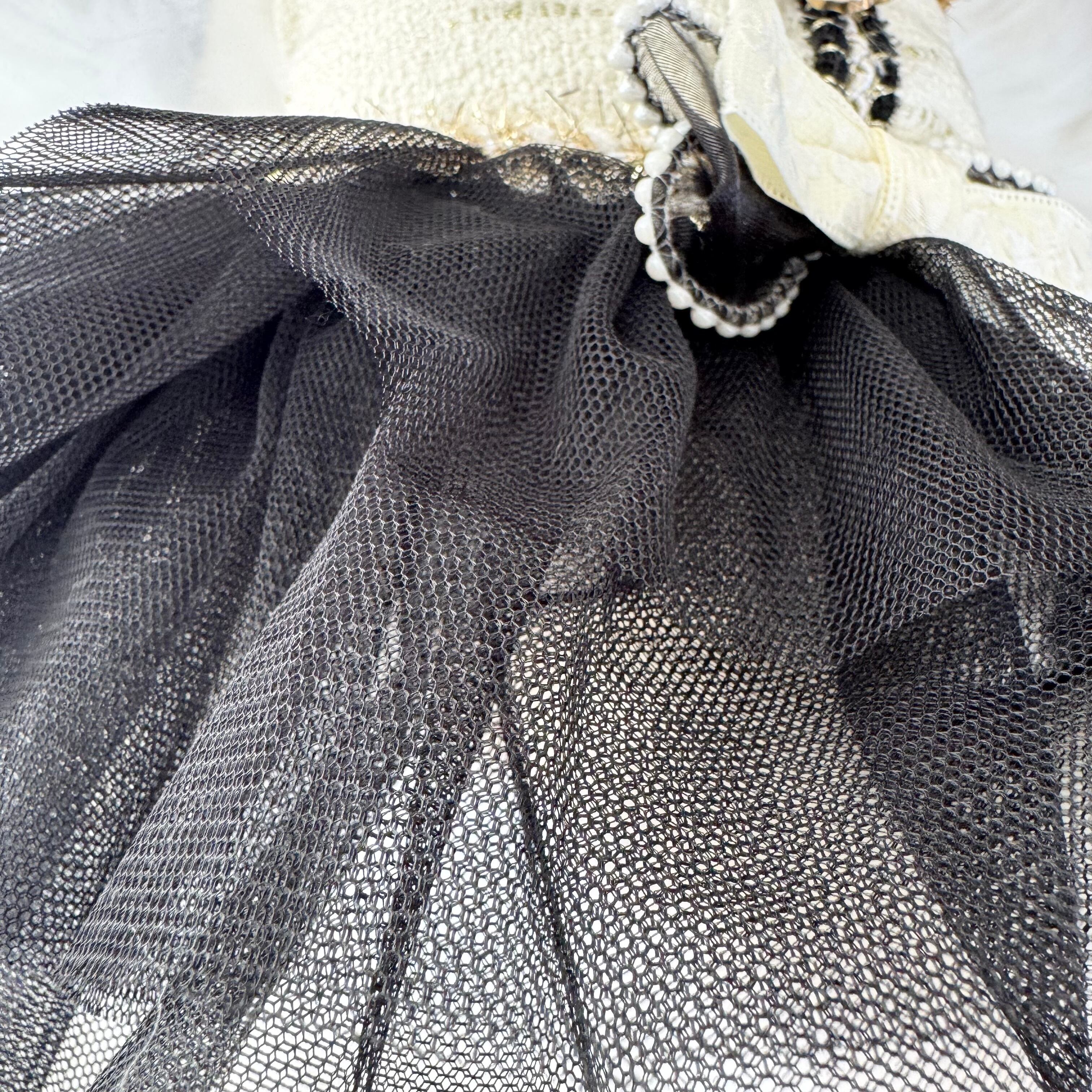 上品なアイボリーツイードに、繊細なパール装飾とふんわり黒チュールのスカートを合わせた、