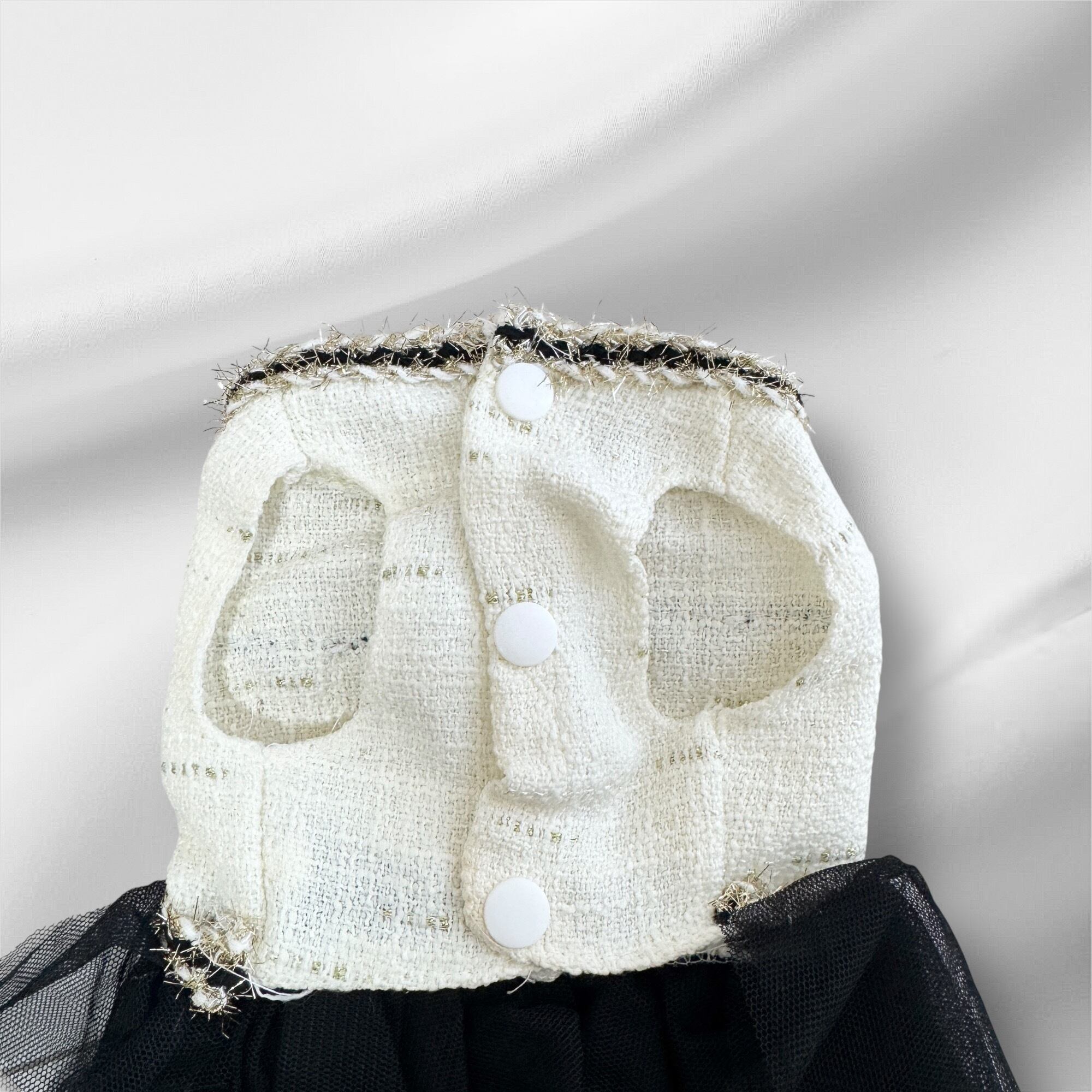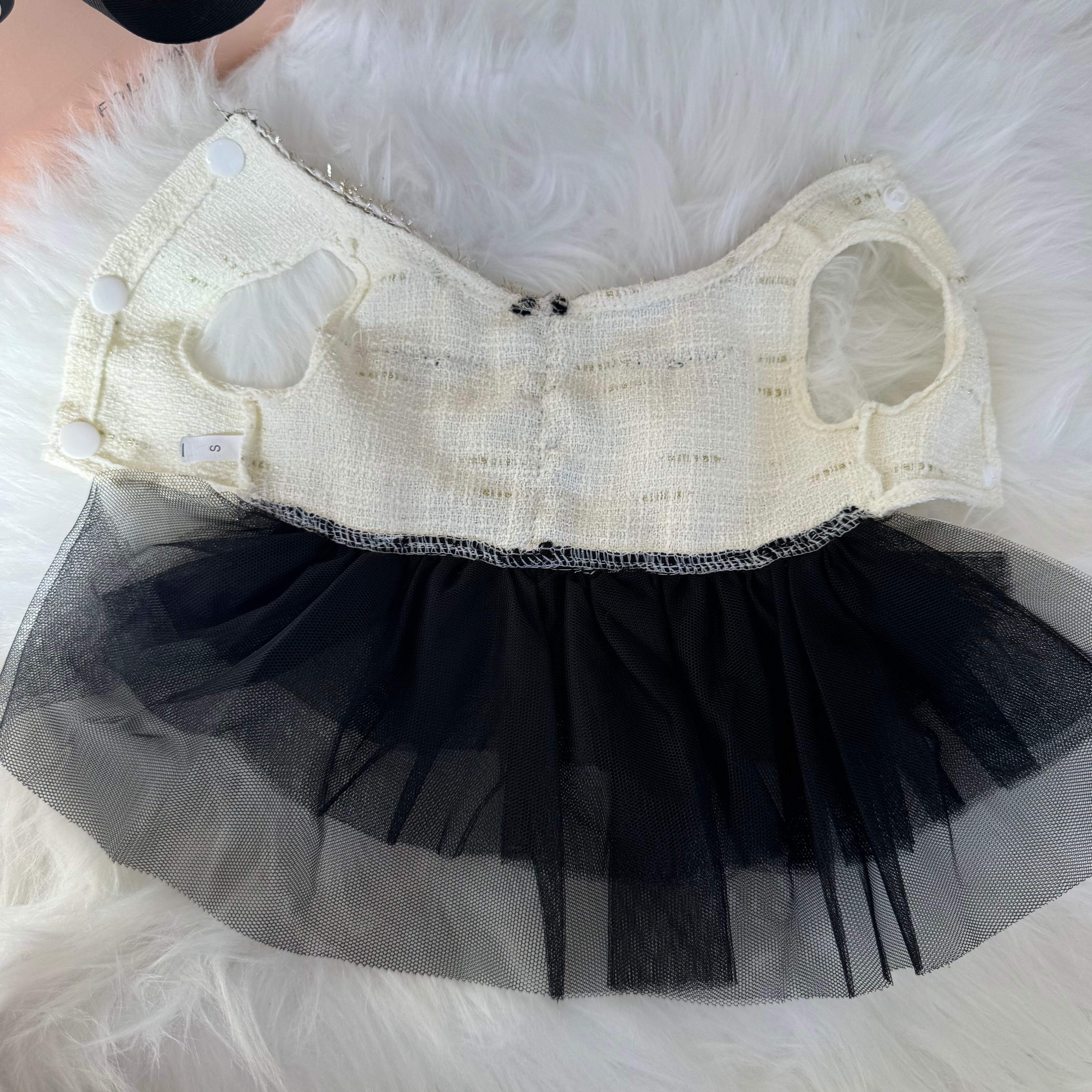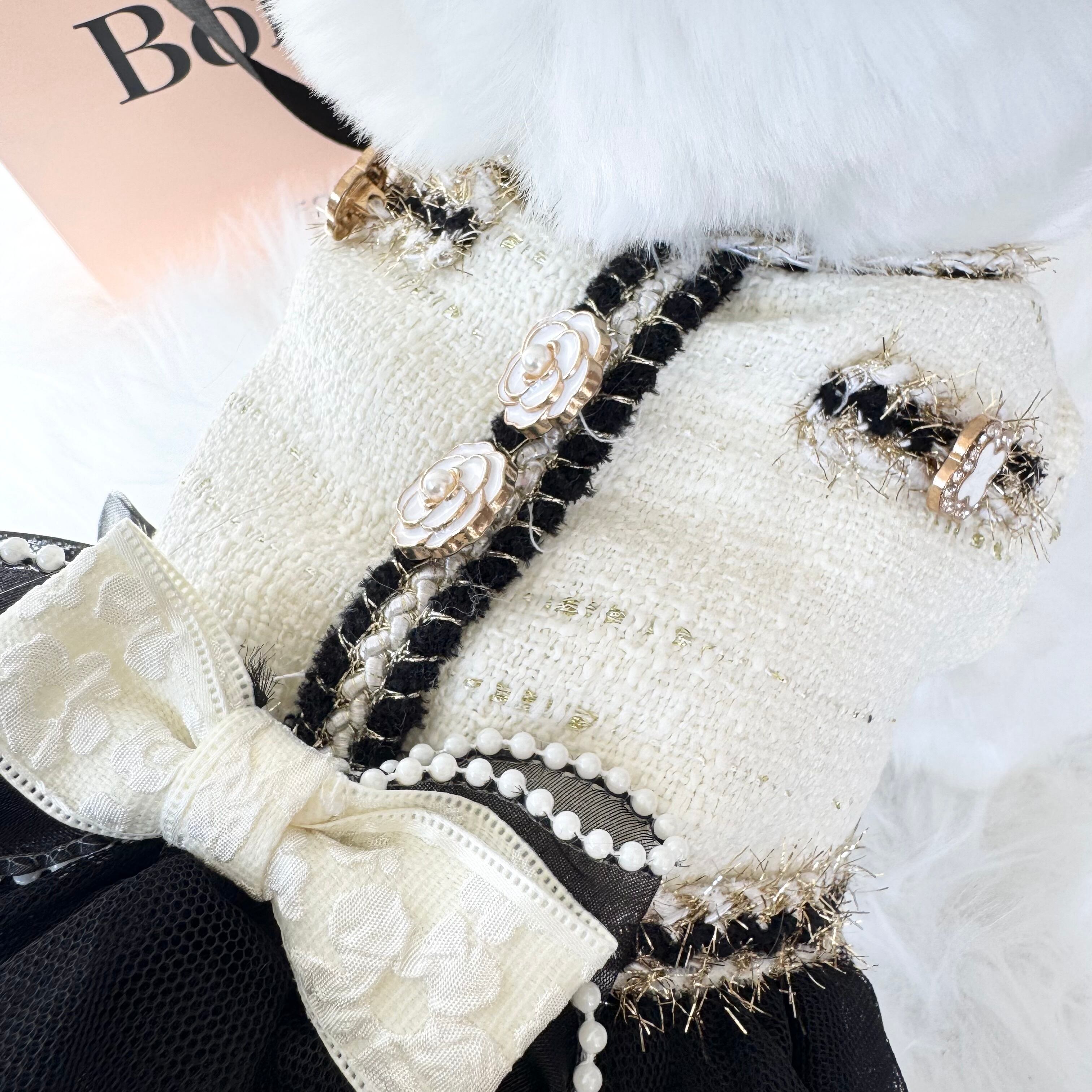 上品なアイボリーツイードに、繊細なパール装飾とふんわり黒チュールのスカートを合わせた、