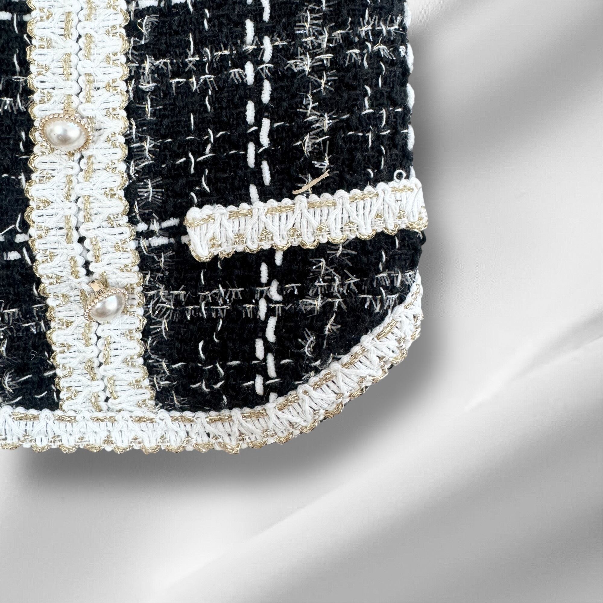 ✔️ 高級感あるツイード素材&パールボタンデザイン