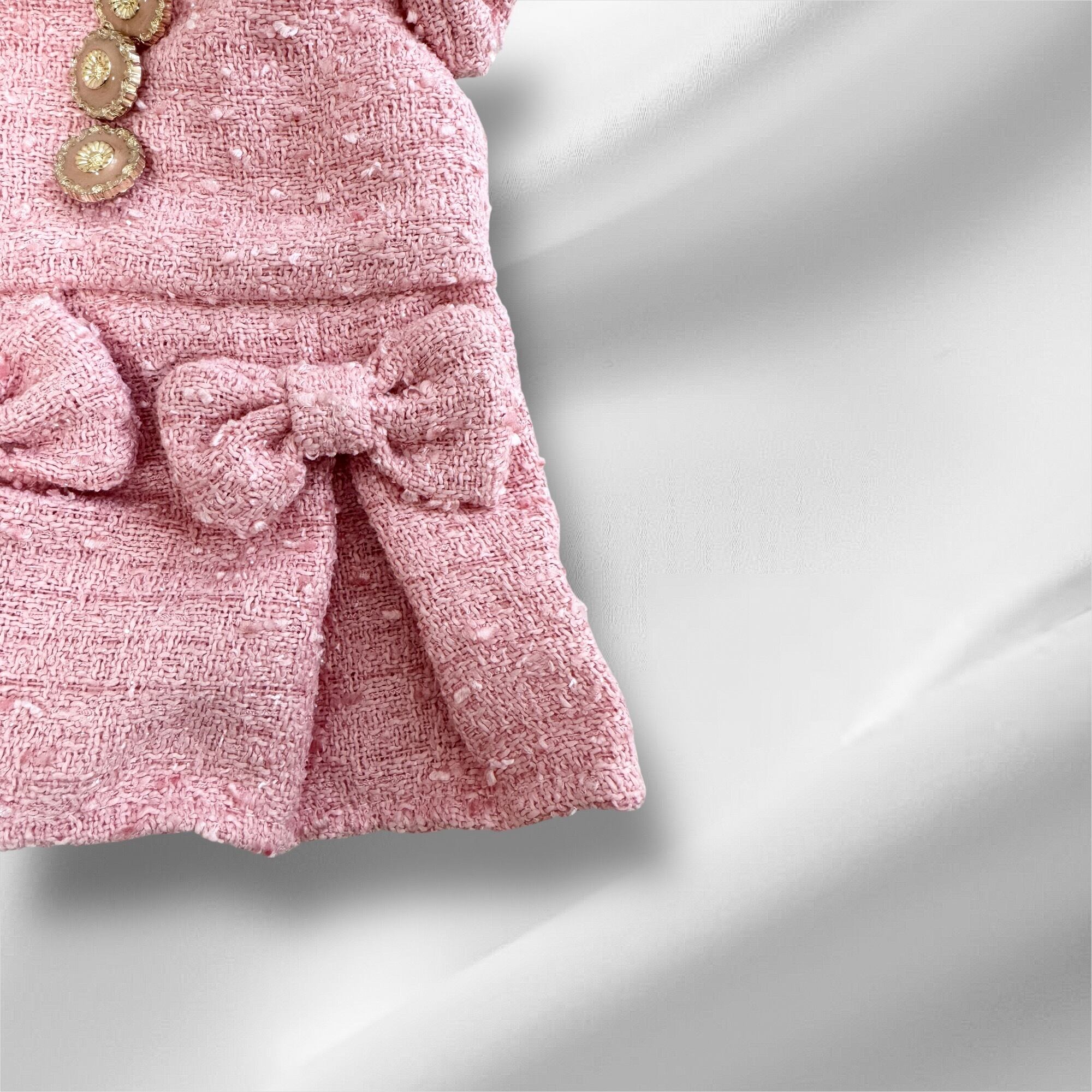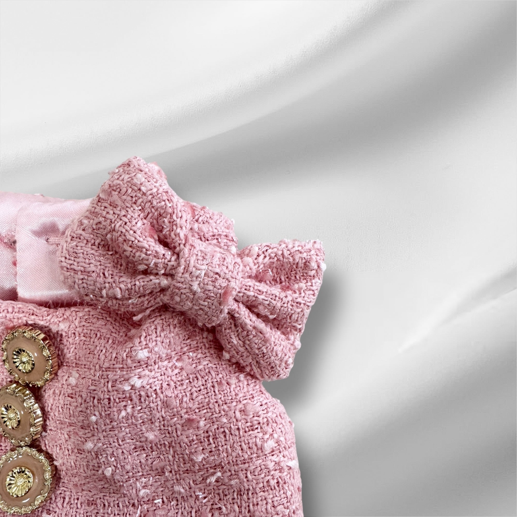 きらめくツイード素材に、大きなリボンとパールのアクセントを加えた高級感たっぷりの一着。
