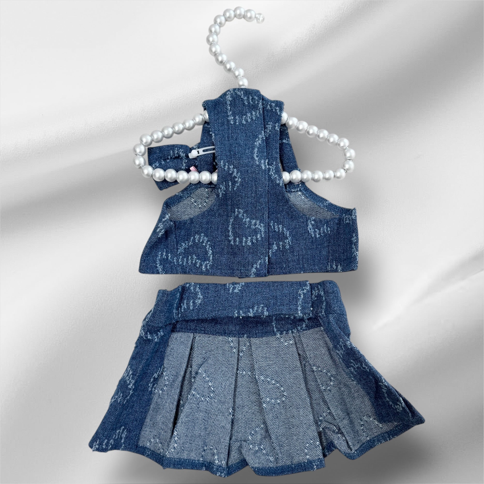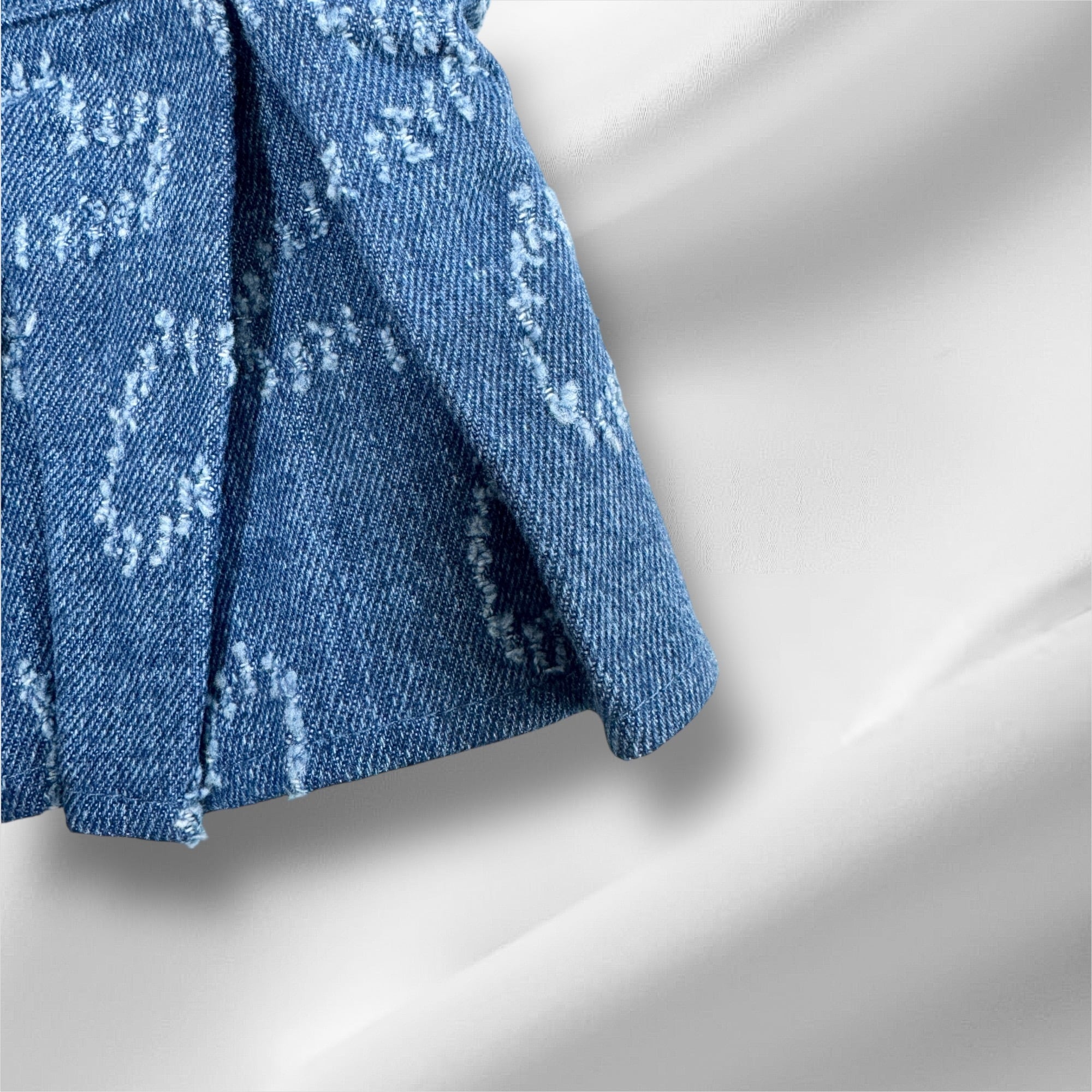 立体的なプリーツスカートとハート柄デニムがキュートな1着。