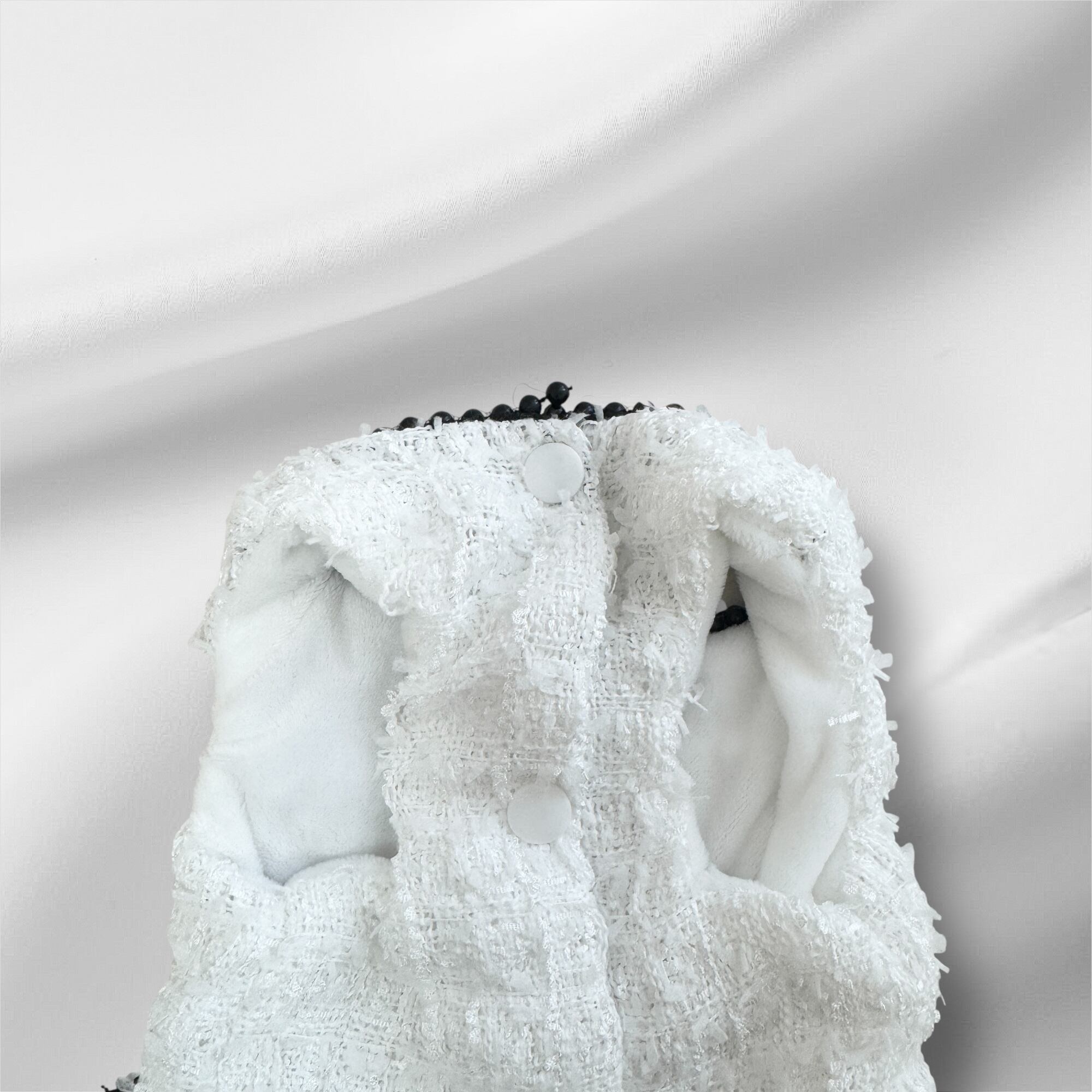 上品なホワイトツイードに、ブラックのパールボタン&サテンフリルを組み合わせたラグジュアリーなドレス。